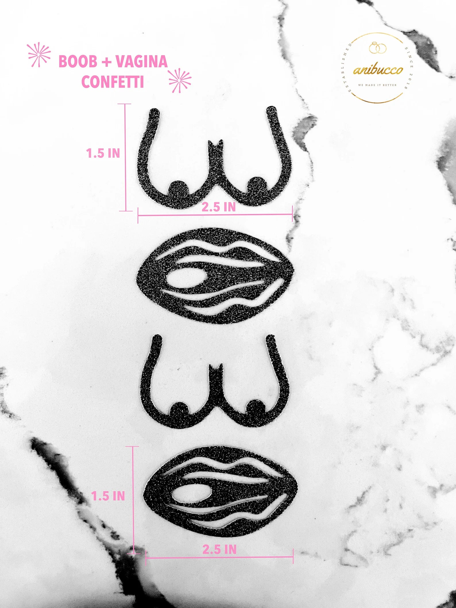 Sprinkle some fun into your bachelor(ette) and mastectomy parties! This playful glitter accessory will definitely get the party started! Made with durable glitter and premium card stock, these confetti pieces will add a touch of whimsy to any celebration. Great for sprinkling on tables, counters or even stuffing invitations!