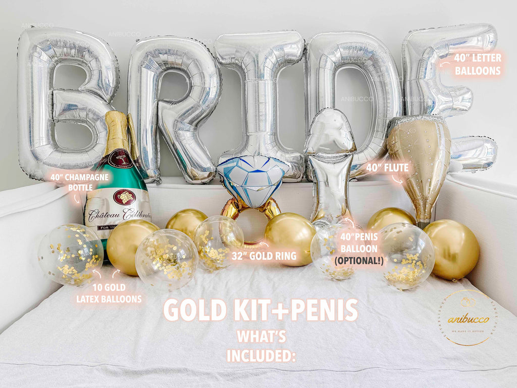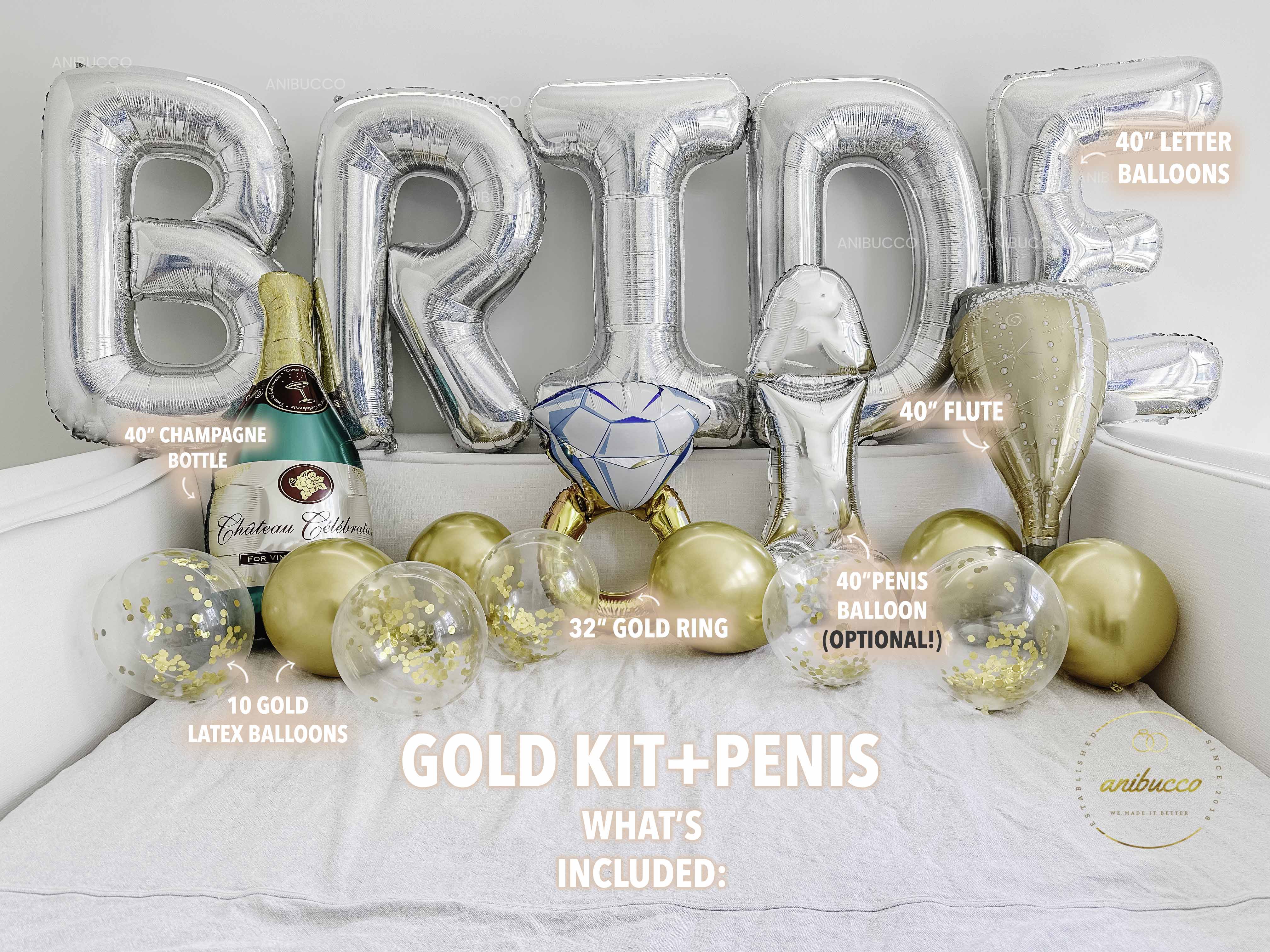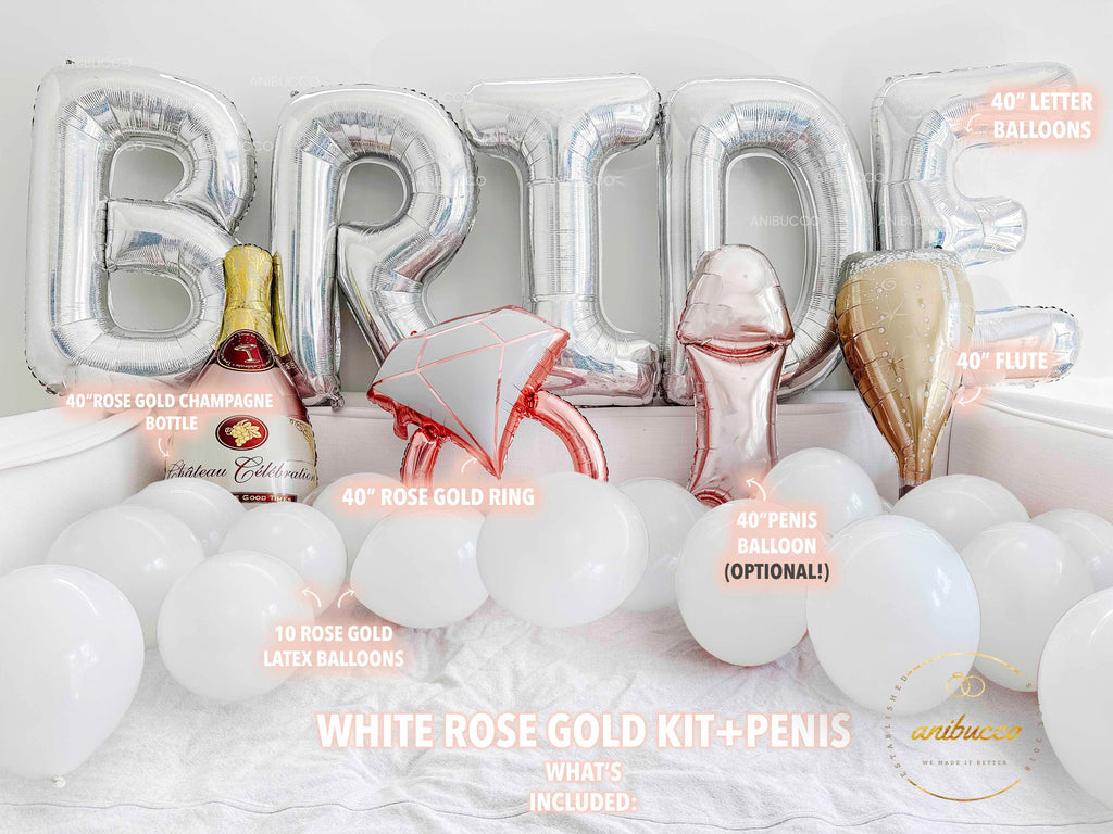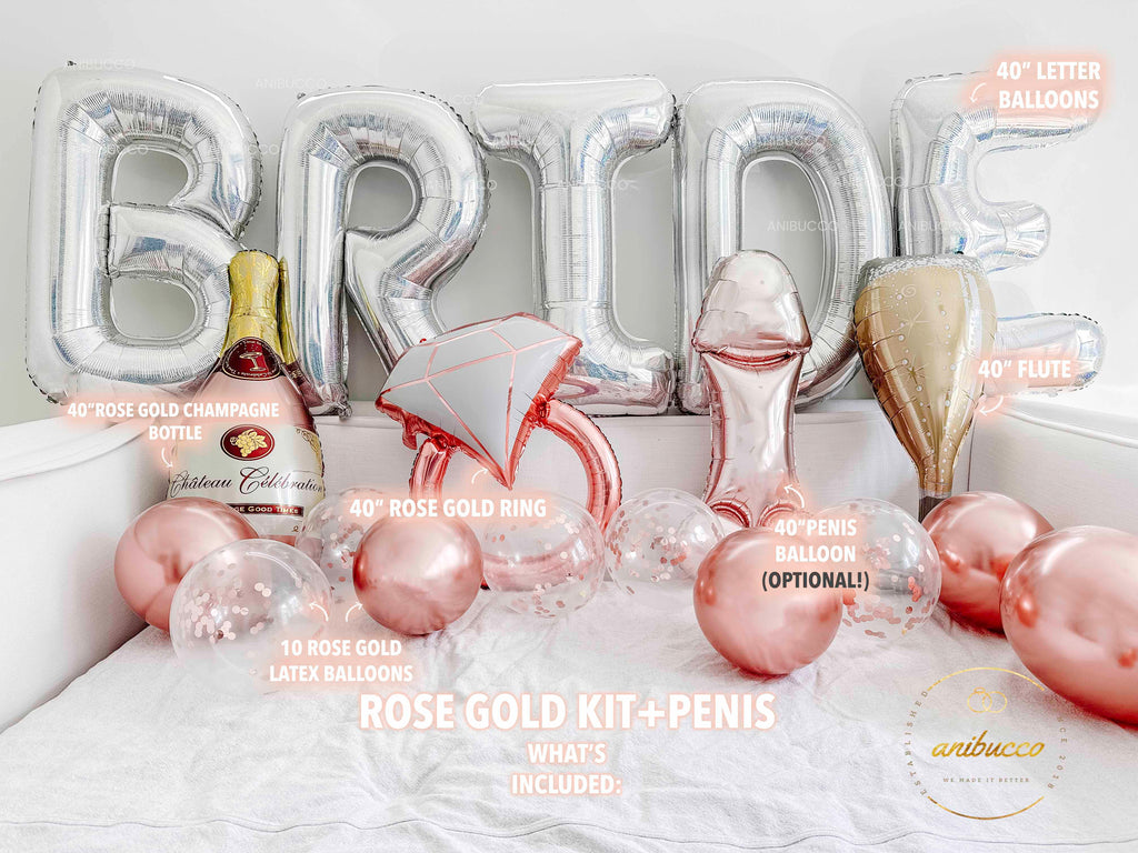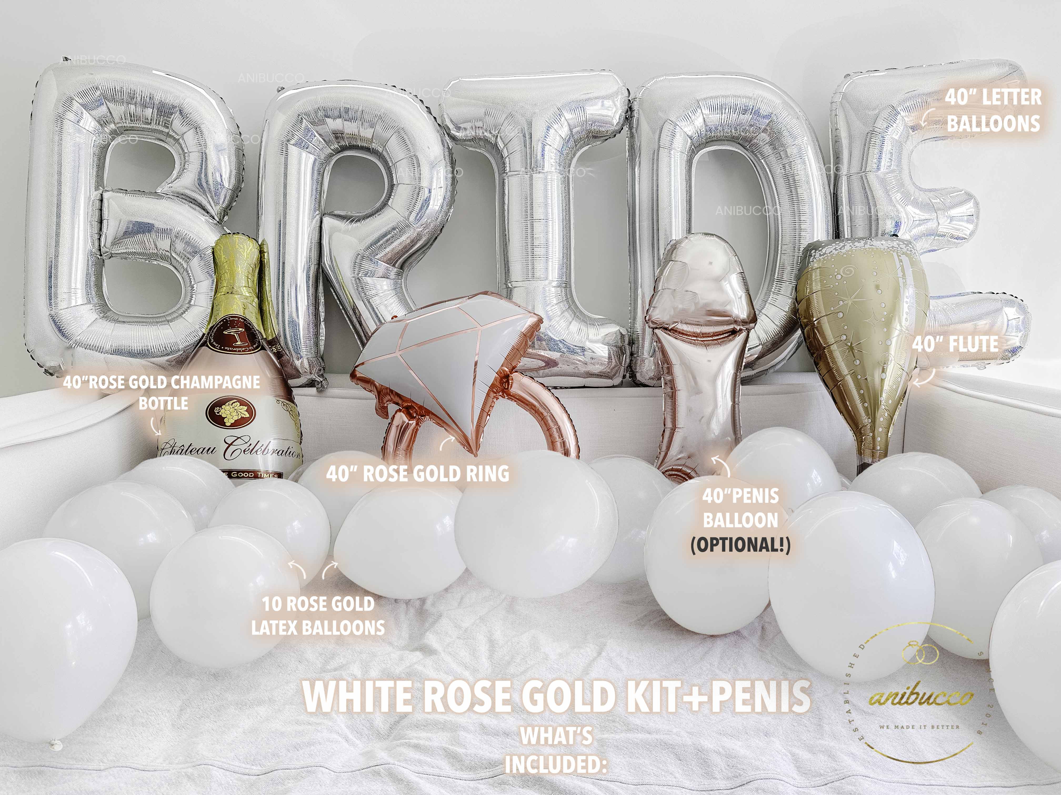Includes: 40” Bride, Flute, Ring, Champagne and Latex Balloons. Optional: 40" Rose Gold or Silver Penis Balloon!