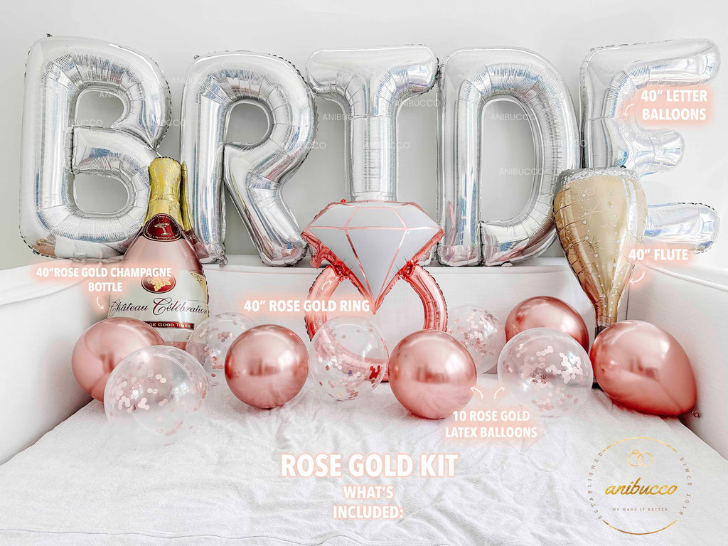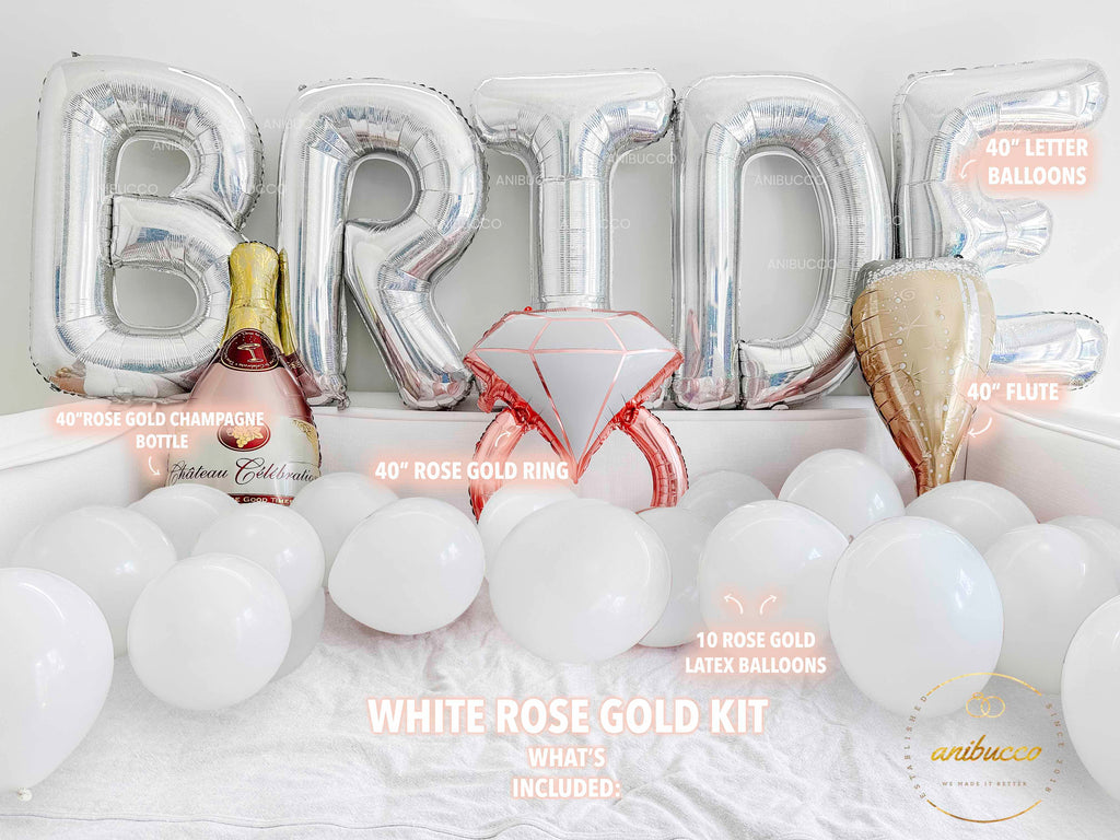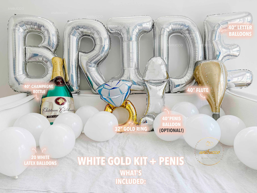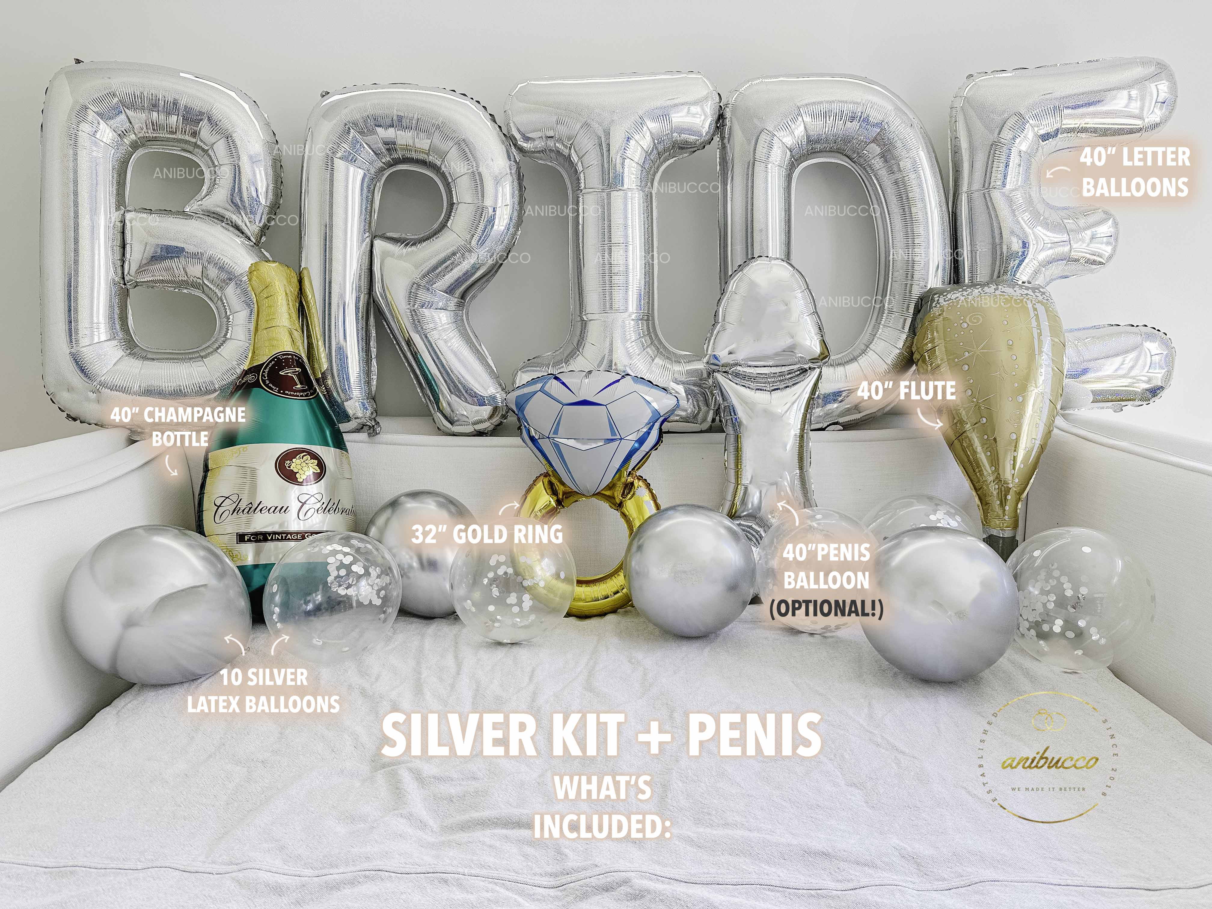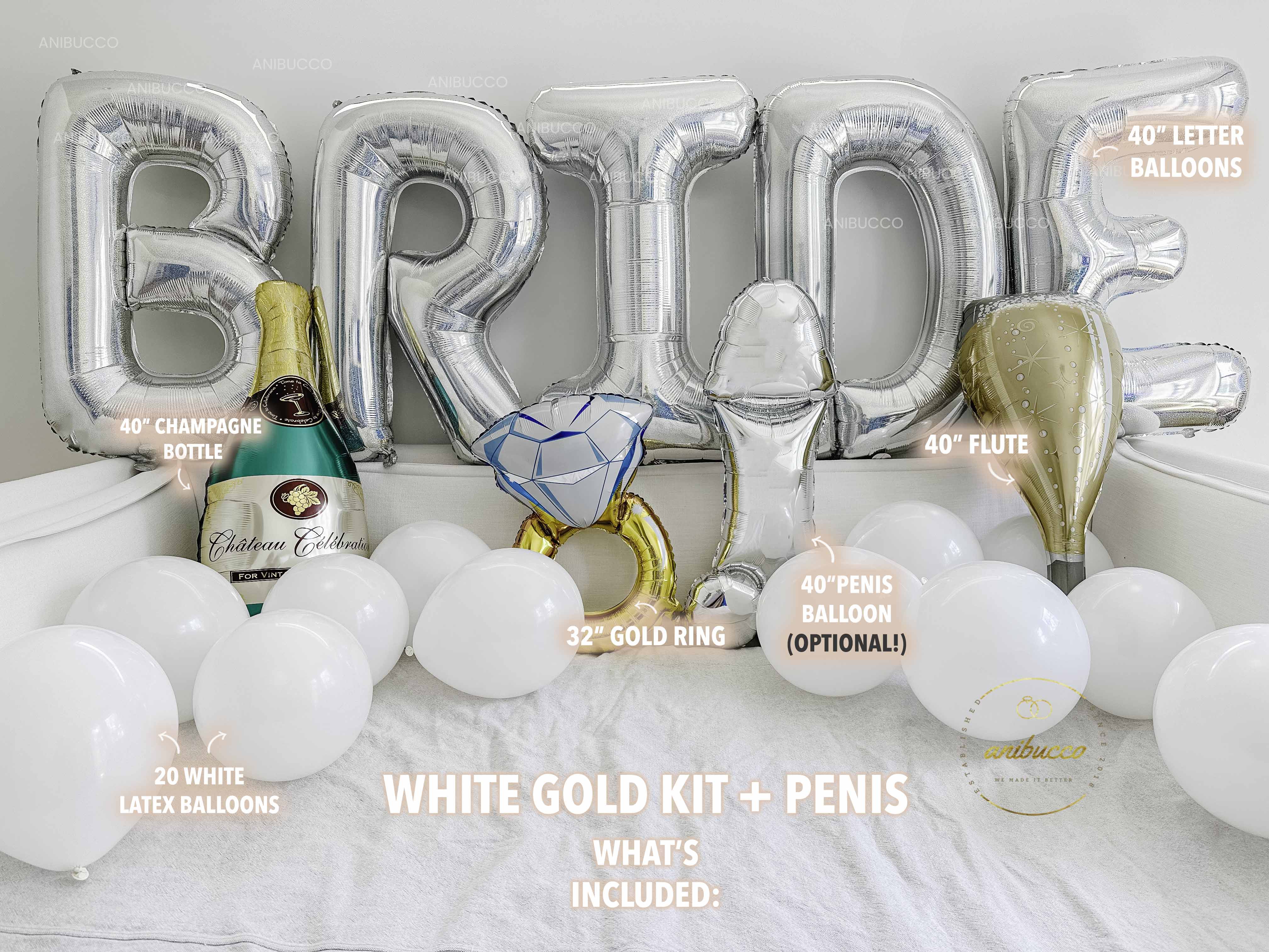 Includes: 40” Bride, Flute, Ring, Champagne and Latex Balloons. Optional: 40" Rose Gold or Silver Penis Balloon!