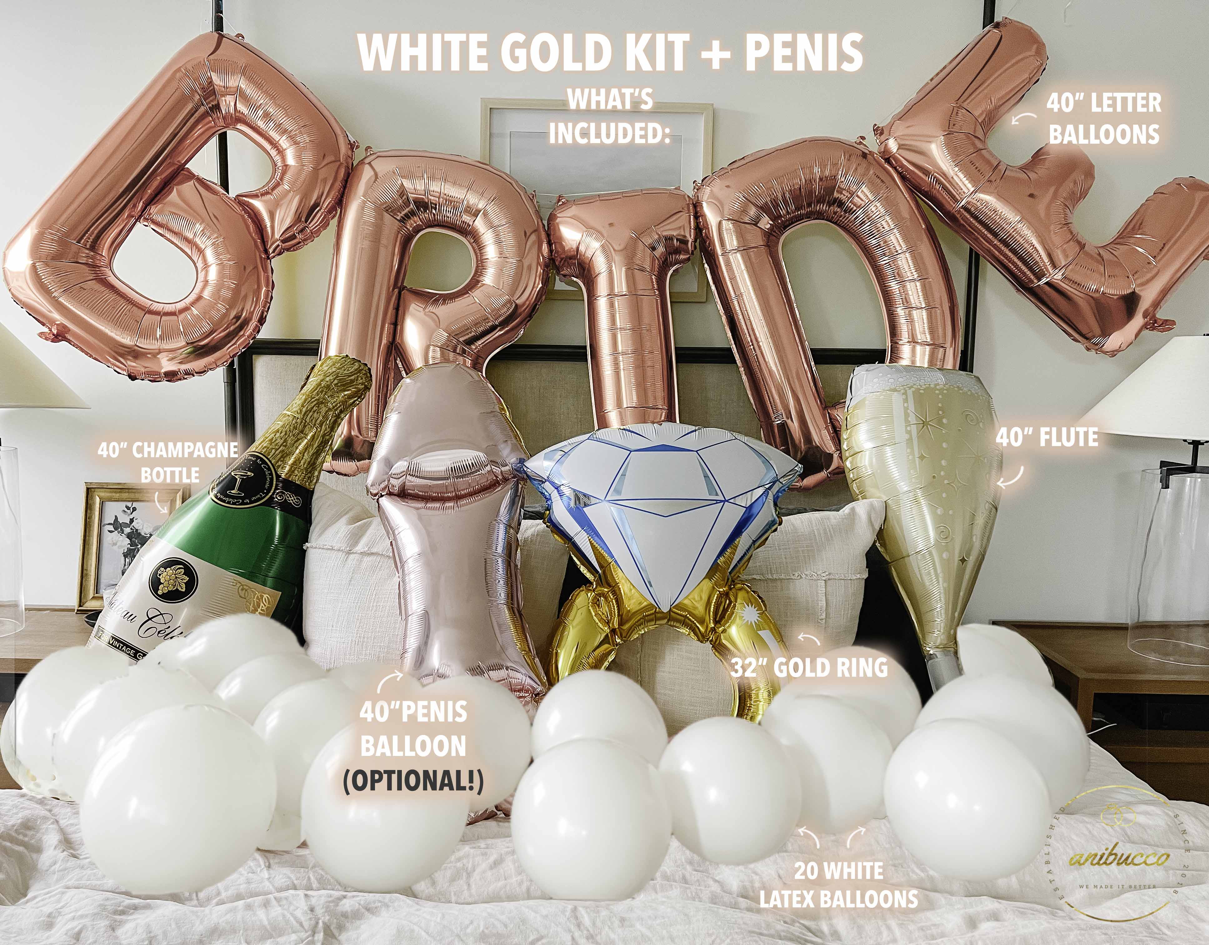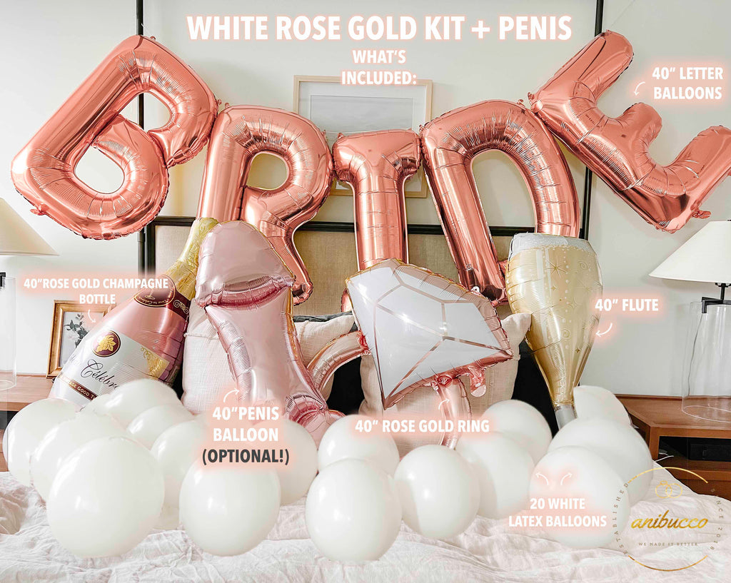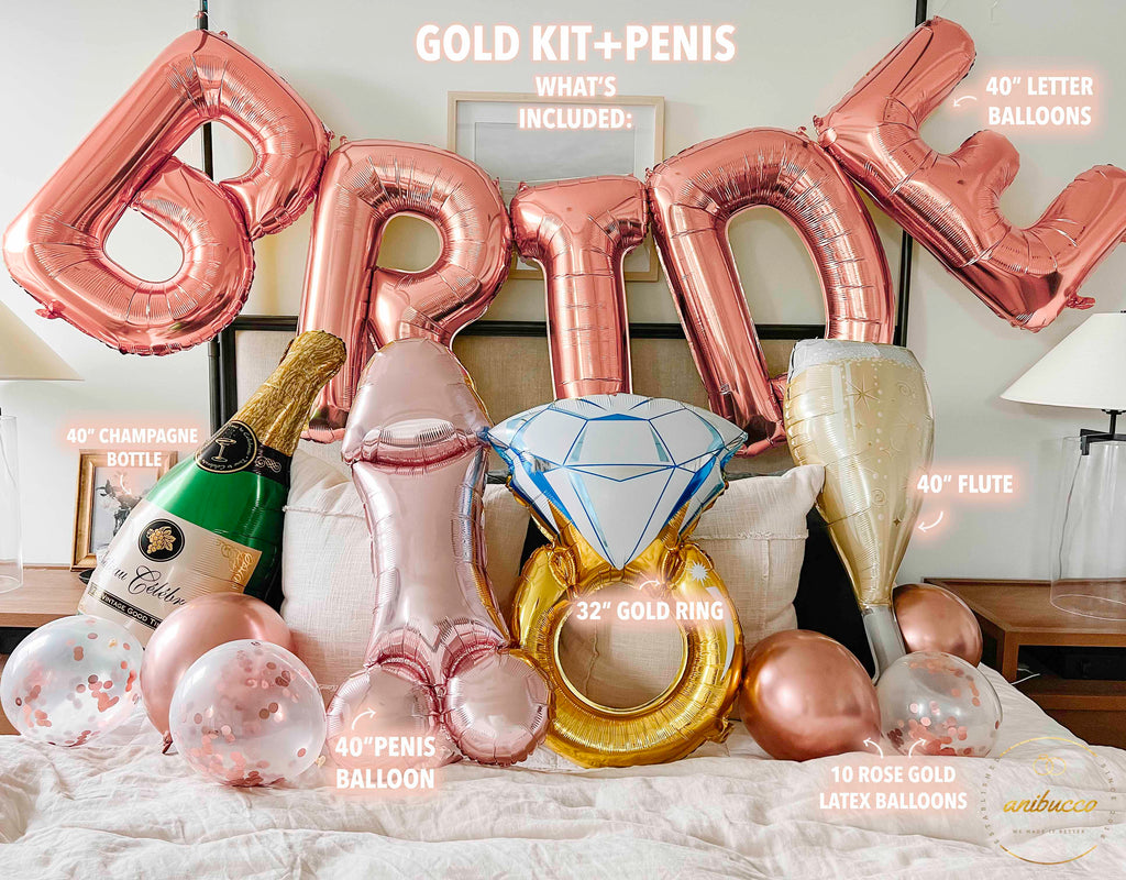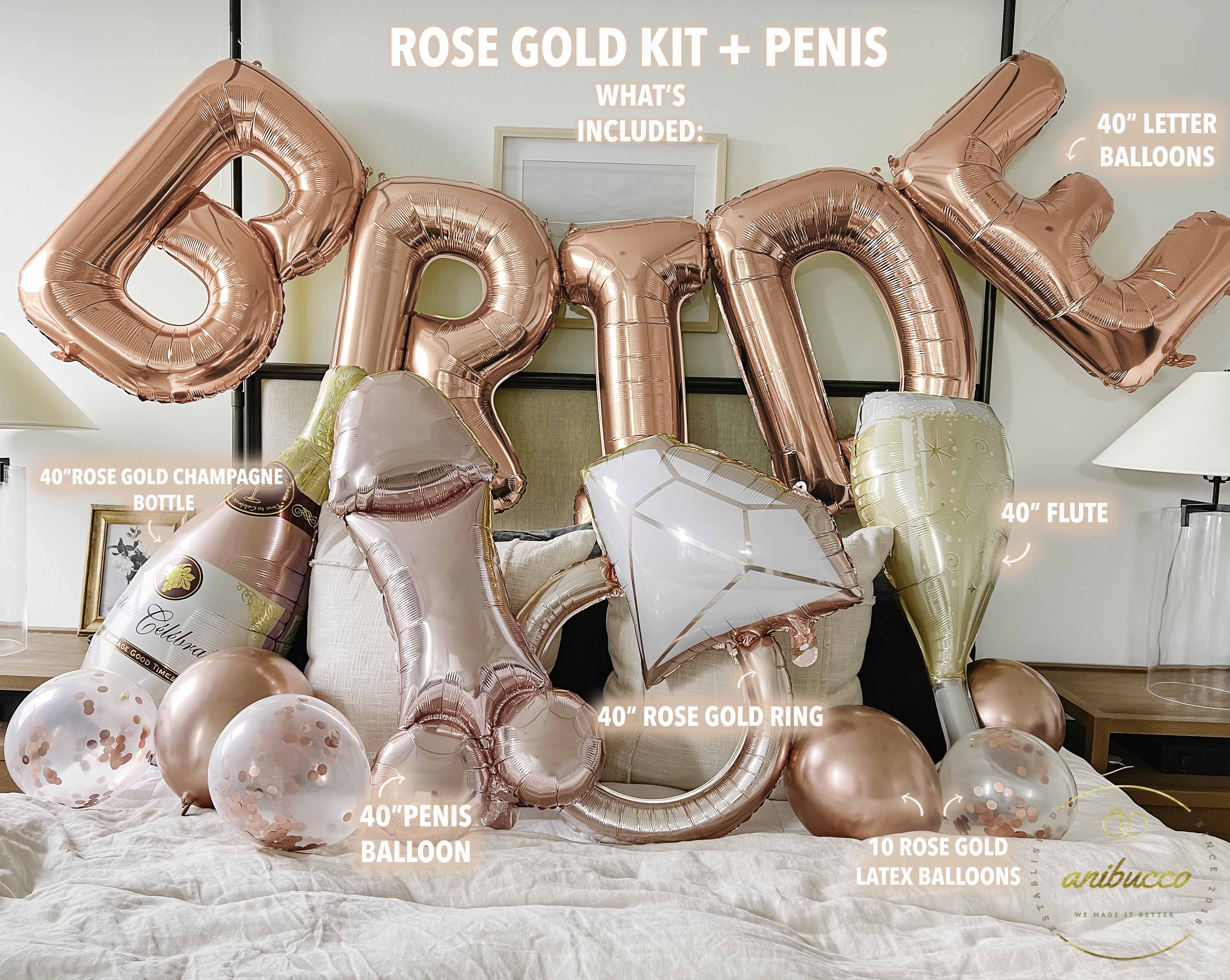 Includes: 40” Bride, Flute, Ring, Champagne and Latex Balloons. Optional: 40" Rose Gold Penis Balloon!