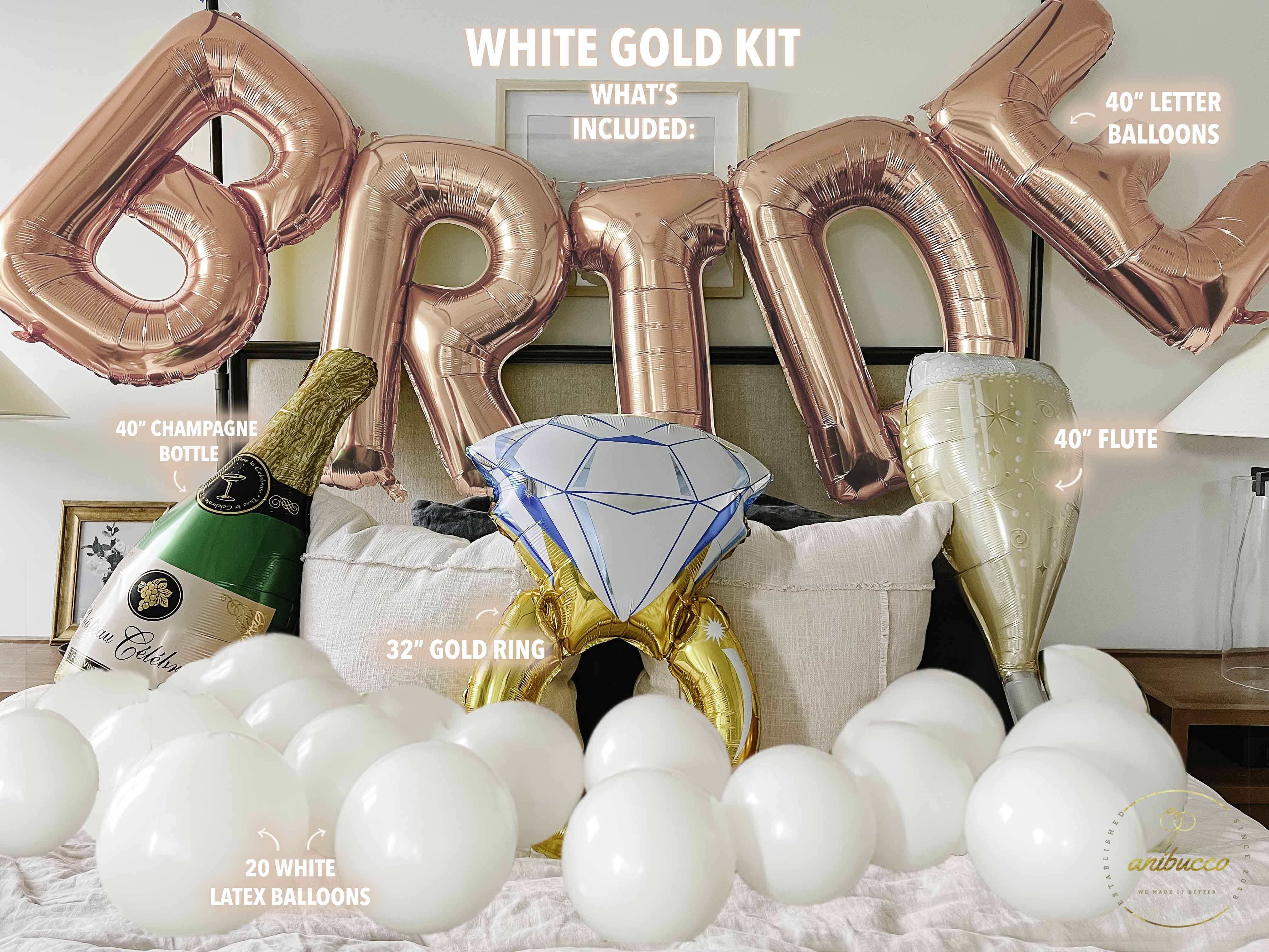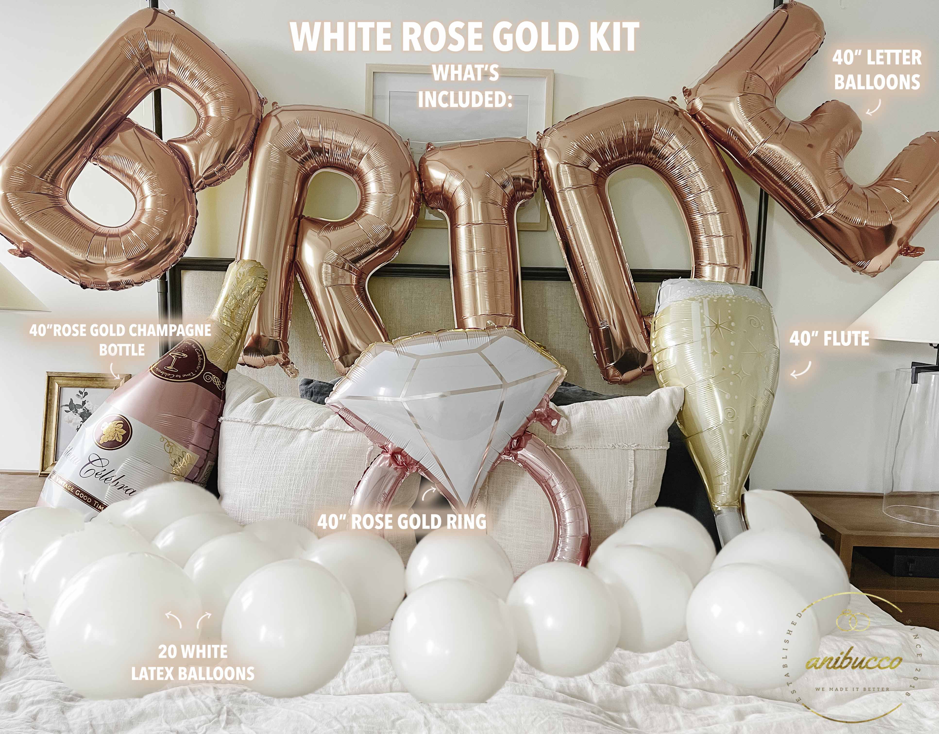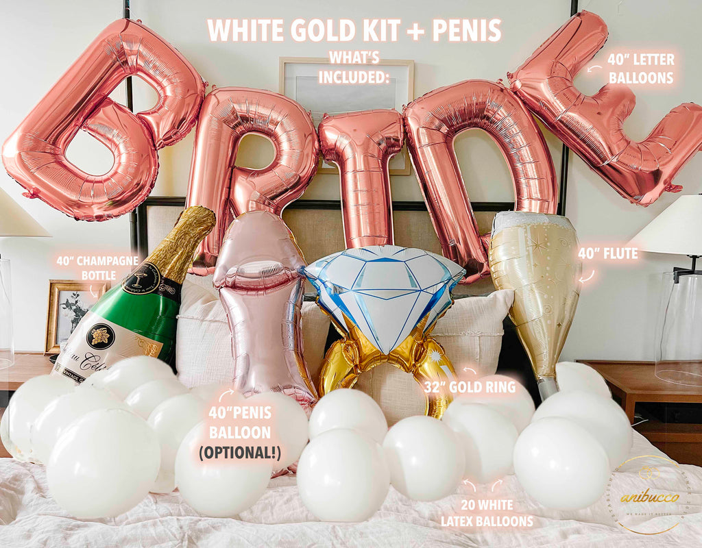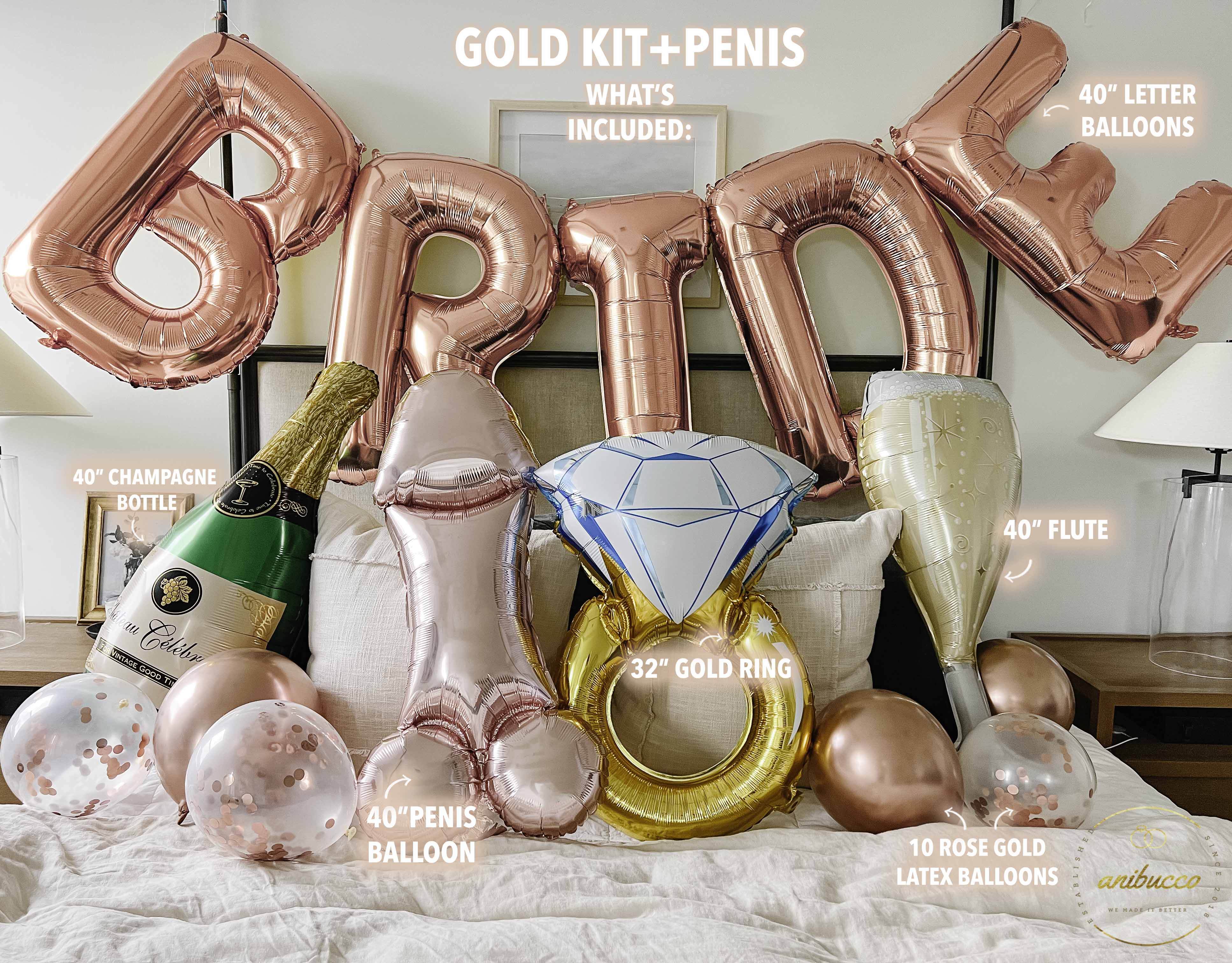 Includes: 40” Bride, Flute, Ring, Champagne and Latex Balloons. Optional: 40" Rose Gold Penis Balloon!
