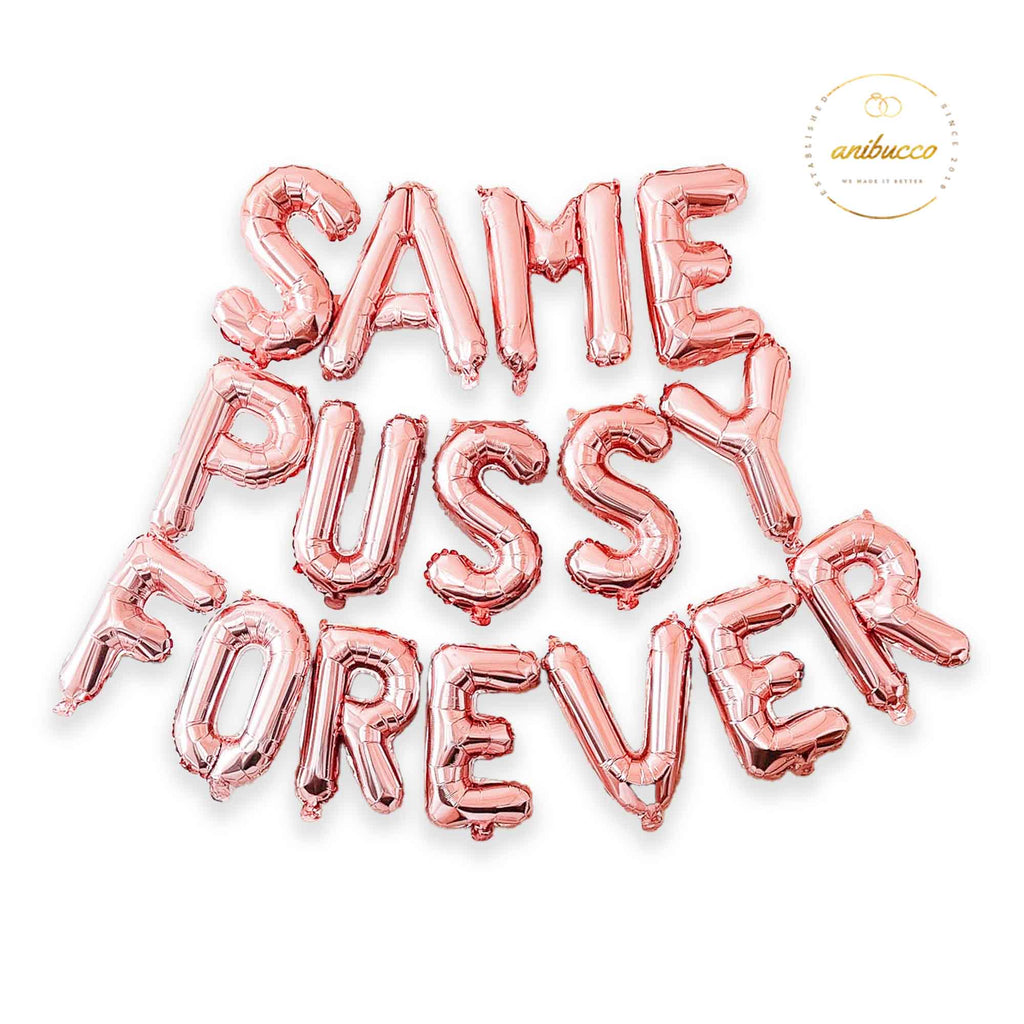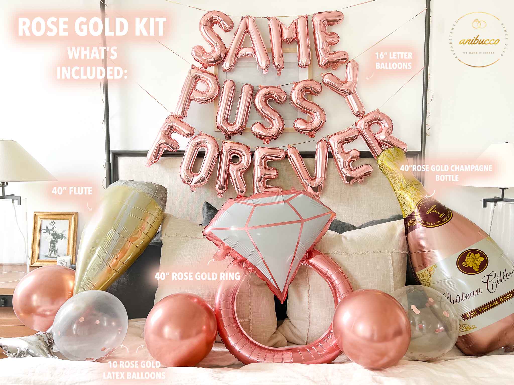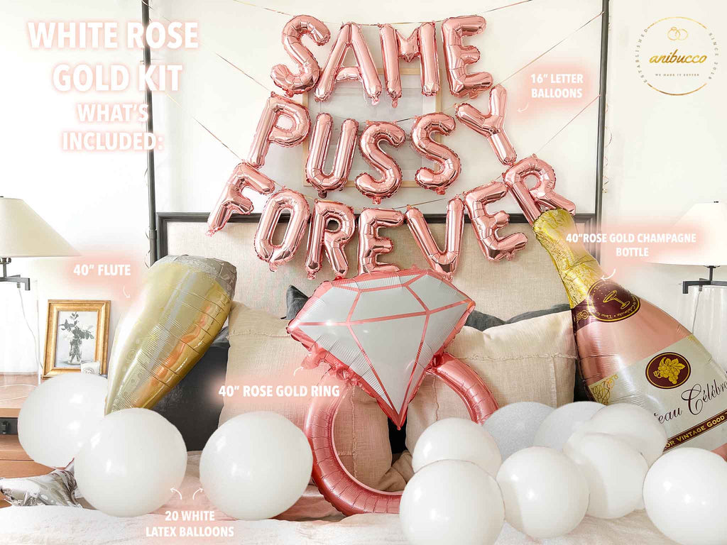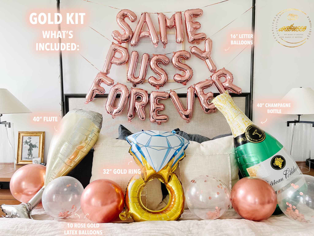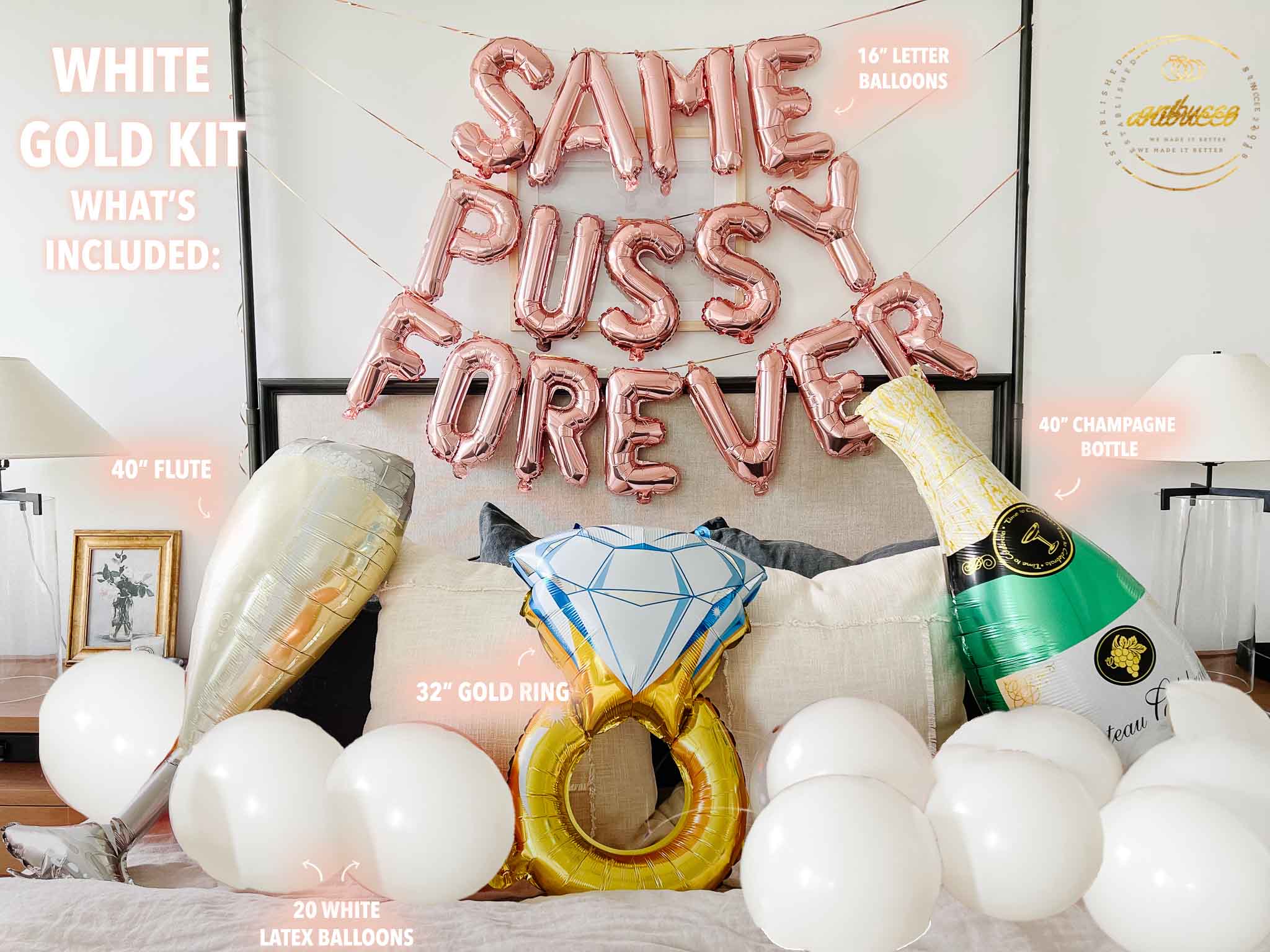 Includes: 16” Same Pussy Forever, Flute, Ring, Champagne and Latex Balloons.